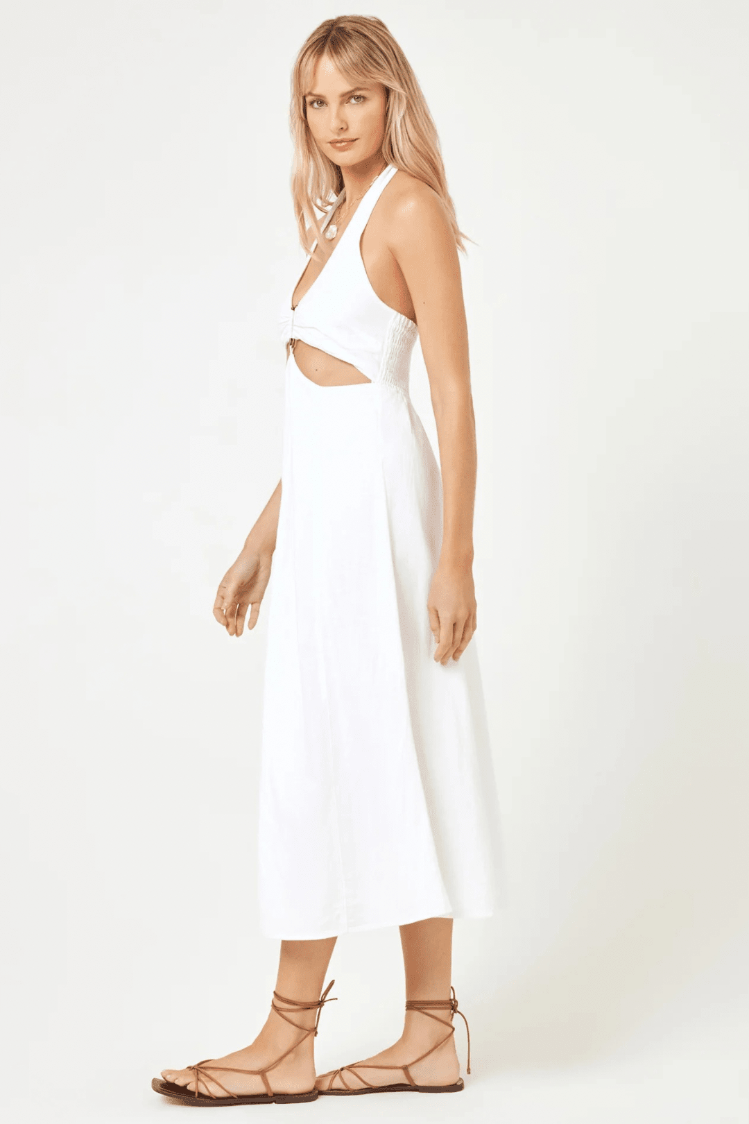 Things are lookin' pretty in poplin with the Eliza Dress. A halter-tie neckline lends a sexy sophistication and ruching on the back, gold metal hardware details and front cut-outs round things out. This midi feels luxe and substantial thanks to the slip lining.
